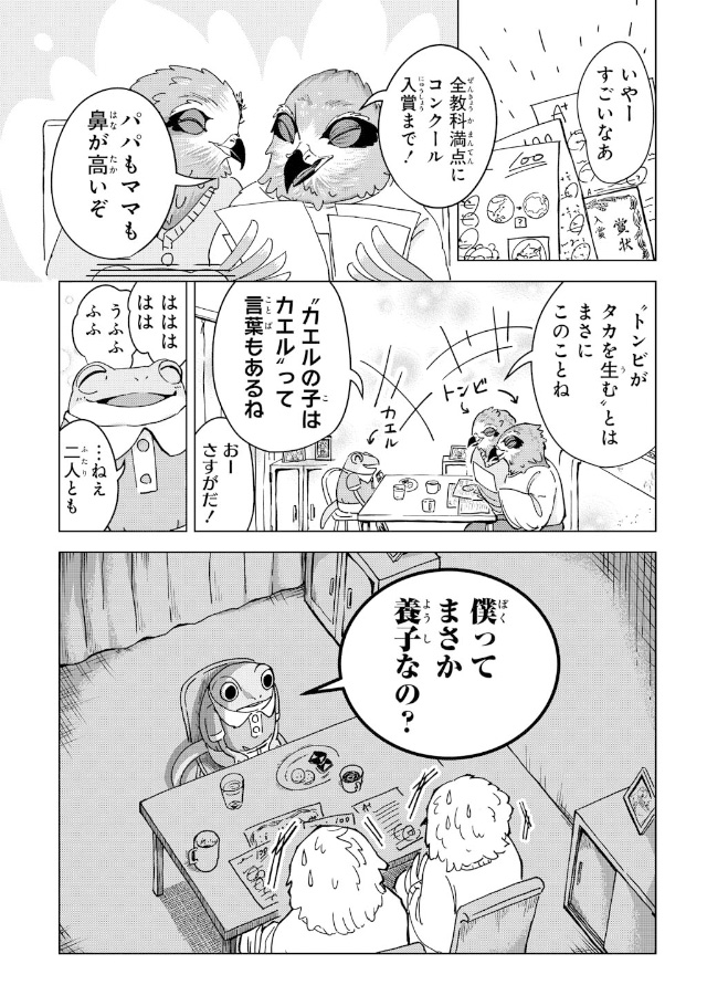 微笑ましい家族の会話から、誰もが知ることわざを通して衝撃の真実に繋げる発想力はお見事。
