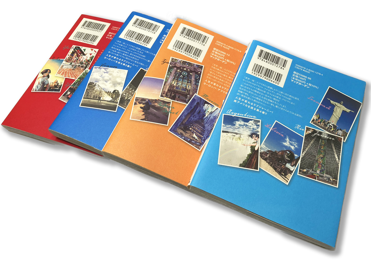 『僕らの地球の歩き方』の装丁は背景をメインカラーとサブカラーで構成しているのですが、このデザインにした理由は、第一に書店やネットでパッと目に留まるようにするため、第二に毎巻の配色を変えることで旅のワクワク感を出せたらと考えたからです。