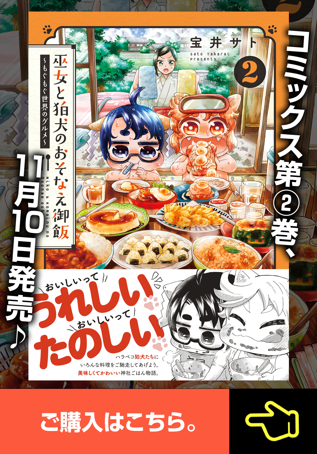 かしこみかしこみモグモグいたす、我ら腹ペコもんすたー♪ とある神社の、ちびっこ狛犬たちは思いました。「たまには、わしょくいがいのゴハンがたべたい!!」 おねだりされた巫女さんが、慣れない料理に四苦八苦しつつ、お供え物の食材で世界のグルメをクッキング!?(やんちゃな狛犬たちも、一生懸命お手伝い)。おいしい笑顔が可愛くて嬉しい、素敵なごはん漫画です。