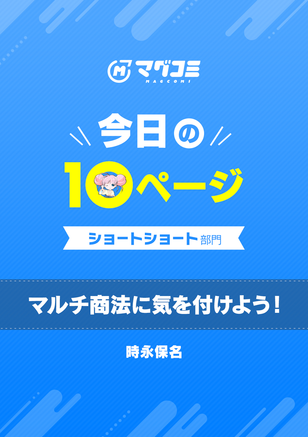 10Pの短編マンガがパッと楽しめるコーナー、作家の個性とアイディアが迸るショートショート部門!数年ぶりに再会した中学校の同級生から、マルチの勧誘を受ける私。常軌を逸する彼女に慄くも、目を覚ますことができるのは自分しかいないことに気付く。そんな私の感動サクセス物語が始まるかも!?