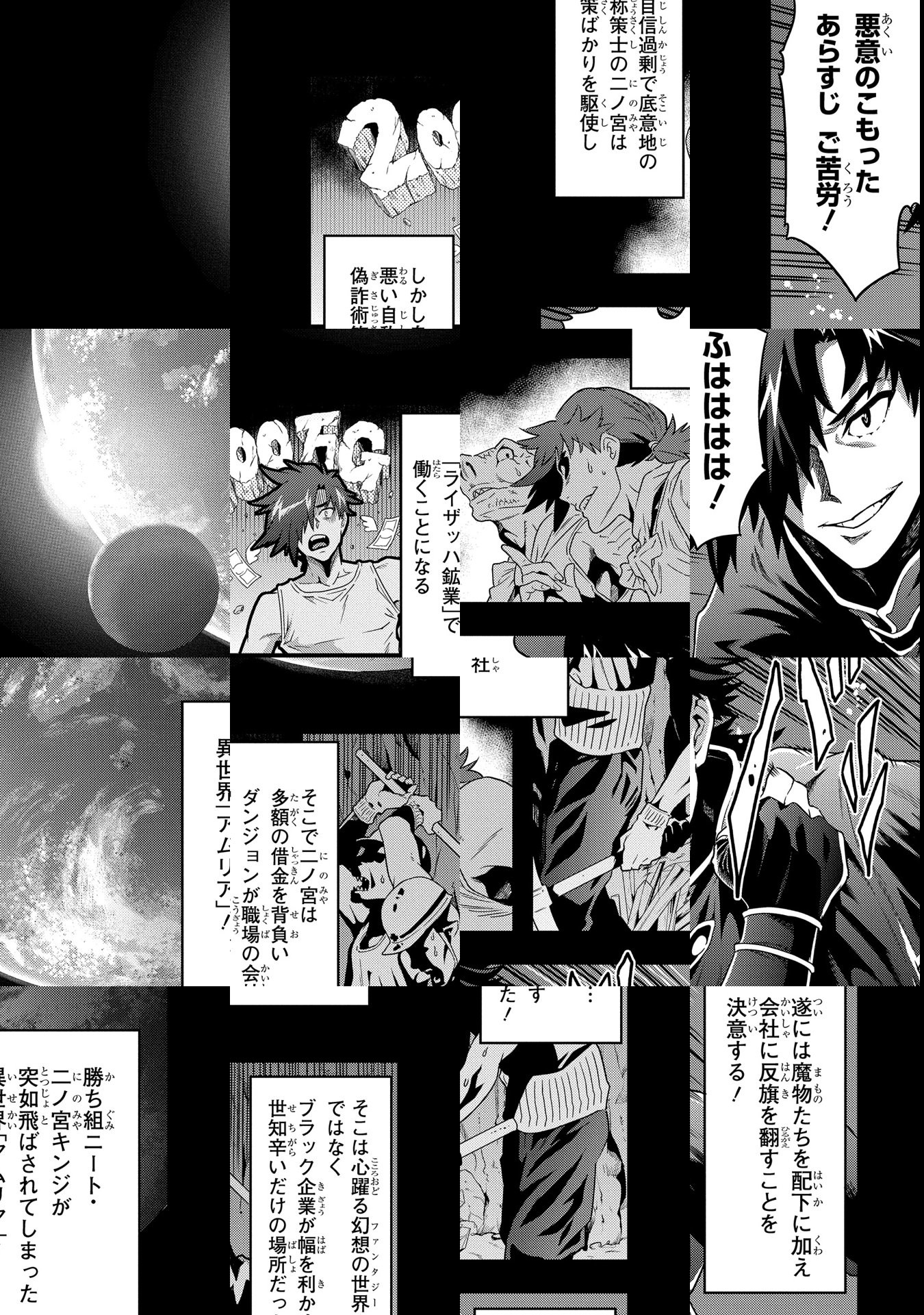 【毎月第2金曜日更新】働きたくない…その思いから努力を重ね、ネオニートとなった男・二ノ宮キンジ。そんな彼が何の因果か異世界に転移、辿り着いたのは“迷宮が職場”のブラック企業だった。雀の涙な低賃金、長大な勤務時間、悲惨な労働環境――生き残る為に死ぬほど働く、社畜的ダンジョンファンタジー!