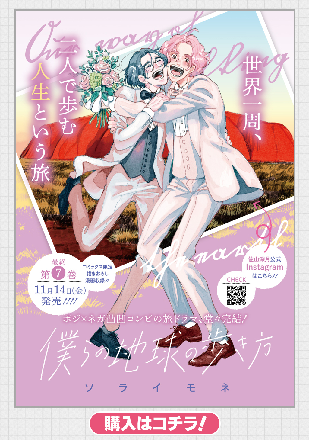 【毎月第1火曜日更新】几帳面で心配性な朝日は、とあるきっかけから恋人の深月と世界一周旅行に出た。お互い初めての海外旅行。自由気ままなみつきにヤキモキさせられながらも異国の文化や出会いは二人の価値観を変えていく。出発時に交わした“世界一周二人でできたら結婚しよう”その約束は果たされるのか――!? ネガポジ同性カップルの世界をまたにかける旅ドラマ!