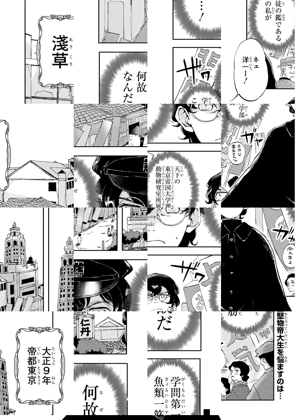 10Pの短編マンガがパッと楽しめるコーナー、作家の個性とアイディアが迸るショートショート部門! 大正9年帝都・浅草。娯楽には一切目もくれず、魚類研究一筋で過ごしてきた洋一は謎の女・ジュリと出会う。女に現を抜かしている場合ではないと固く誓う洋一だが、ジュリの勢いに押され一緒に浅草を巡ることになり……。