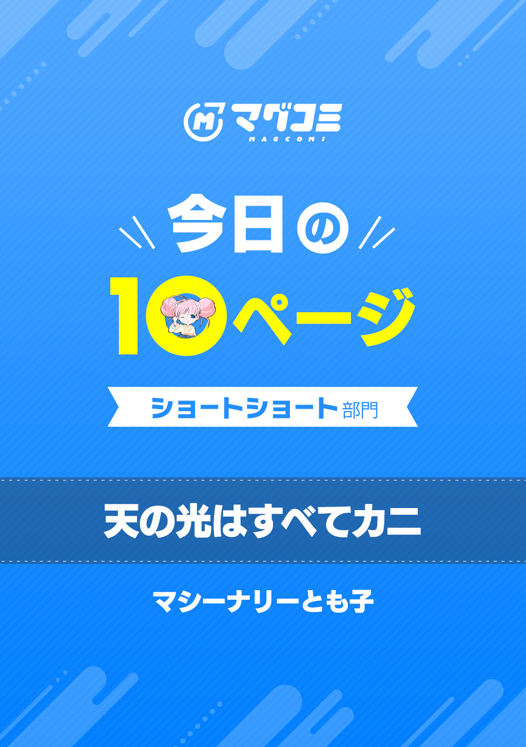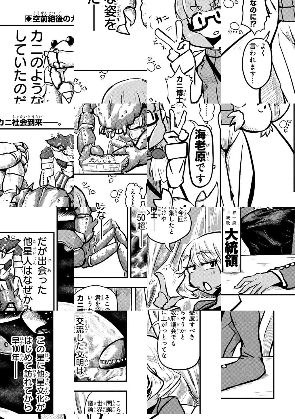 10Pの短編マンガがパッと楽しめるコーナー、作家の個性とアイディアが迸るショートショート部門! 異星人来訪より一世紀。星際社会で存在感を示すべく宇宙進出を狙う人類に大きな問題が立ちはだかる。なんと来訪した異星人はみな「カニ」の姿をしていたのだ。宇宙に出れば人類も「カニ」に――? 疑念を晴らすべく、世界をまとめる大統領を中心にした有識者会議が始まる――!
