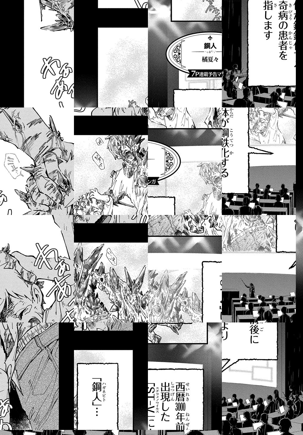 鋼人――ウイルスによって体が鋼鉄化し、暴れ狂う感染者のこと。対策機関に所属するクロガネは、鋼人を喰らい、消滅させることができる人体兵器として暗躍していた。感染収束に向けて、クロガネは今日も鋼を喰らい続ける。そして、このウイルスに込められた“悪意”を、彼は身をもって知ることになる――…。